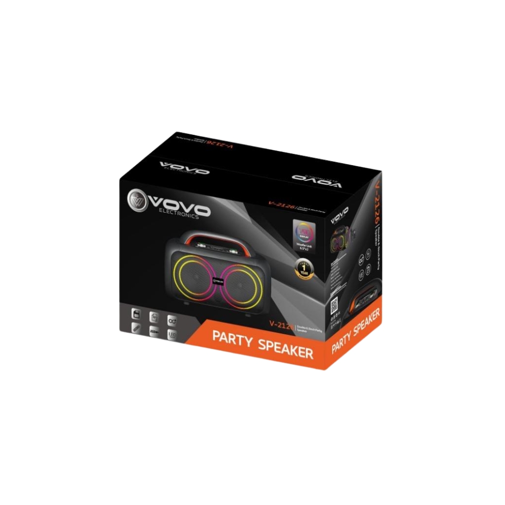Delivering 40W RMS power, pulsing LED light show synced to music, included wired microphone for live vocals, and remote control for easy operation, the VOVO V-2126 provides professional-grade entertainment in a compact, portable build. It arrives safely in a color box with foam padding, ready for transport and daily use.